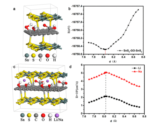 2納米片的堆積。 密度泛函理論計(jì)算揭示了夾層狀復(fù)合材料中間層間距最穩(wěn)定的狀態(tài)。分子模擬和實(shí)驗(yàn)觀測(cè)Li/Na離子的擴(kuò)散系數(shù)結(jié)果表明,該狀態(tài)最適合離子的快速傳輸。此外,固定在石墨烯片上的大量超級(jí)SnS
