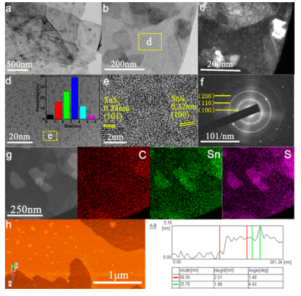 2復(fù)合材料的形貌和結(jié)構(gòu)表征。(a)TEM圖;(b)亮場(chǎng)圖像和(c)暗場(chǎng)圖像;(d,e) HRTEM圖;(f)SAED模式;(g)高角度環(huán)狀暗場(chǎng)圖像及其對(duì)應(yīng)的Sn、S、C元素映射;(h) AFM圖像及相應(yīng)高度剖面。