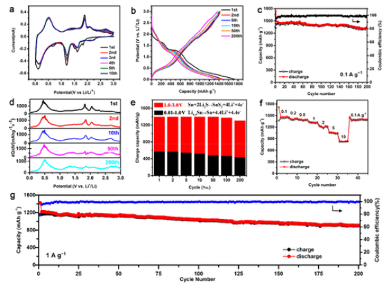 –1下的循環(huán)性能;(d)循環(huán)時(shí)的差別充電容量圖;(e)在 0.01–1.0和1.0-3.0 V電位范圍內(nèi)發(fā)生的可逆充電容量與循環(huán);(f)不同電流密度下的倍率性能;(g)在1 A g