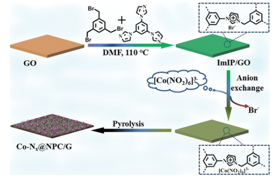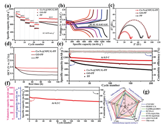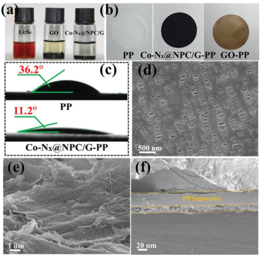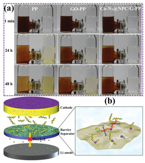 Figure 7.a) PP、GO-PP和Co-Nx@NPC/G-PP隔膜的聚硫化物滲透測量,顯示U型玻璃瓶中多硫化物從左側(cè)向右側(cè)擴(kuò)散;b) Co-Nx@NPC/G-PP隔膜的電池結(jié)構(gòu)示意圖,該隔膜對聚硫化物具有化學(xué)吸附和催化作用。 相關(guān)研究成果于2019年中國科學(xué)院福建物質(zhì)結(jié)構(gòu)研究所Ruihu Wang課題組,發(fā)表在Adv. Energy Mater.( https://doi.org/10.1002/aenm.201901609)上。原文:Separator Modified by Cobalt-Embedded Carbon Nanosheets Enabling Chemisorption and Catalytic Effects of Polysulfides for High-Energy-Density Lithium-Sulfur Batteries