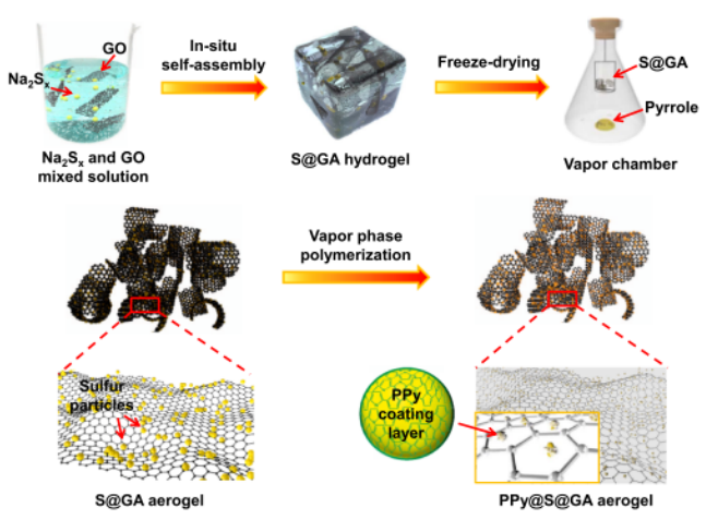 Scheme 1. PPy@S@GA復(fù)合材料合成工藝的三個步驟示意圖:(I)原位自組裝工藝獲得3D多孔石墨烯水凝膠包覆硫前驅(qū)體,(II)冷凍干燥前驅(qū)體,(III)VPP法使吡咯單體覆在S@GA氣凝膠表面。