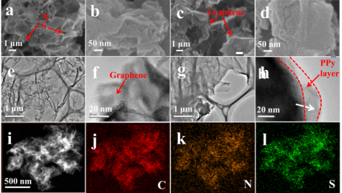 Figure 2. (a,b) S@GA和(c,d) PPy@S@GA不同放大倍數(shù)的SEM圖;(e,f) S@GA和(g,h) PPy@S@GA不同放大倍數(shù)的TEM和HRTEM圖;(i) PPy@S@GA復(fù)合材料單個粒子的STEM 圖,以及(j)碳、(k)氮和(l)硫的元素映射。