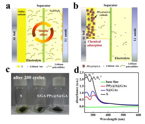 Figure 4. (a)硫電極和(b) PPy@S@GA電極在Li-S電池中的示意圖。(c) S、S@GA和PPy@S@GA電極浸泡在DOL/DME溶液中的照片。(d) PPy@S@GA、S@GA、S電極循環(huán)200次后在DOL/DME溶液中的紫外/可見吸收光譜。