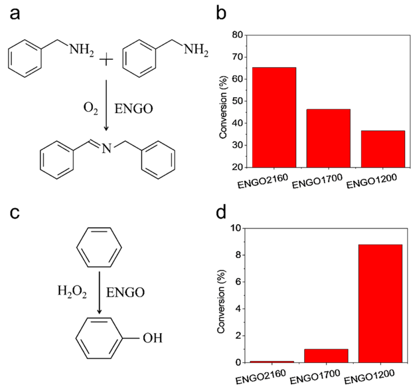 Figure 6. 不同尺寸的ENGO的催化性能表征。ENGO作為催化劑時(shí),(a,b)苯甲胺氧化偶聯(lián)反應(yīng)示意圖及其轉(zhuǎn)換效率,(c,d)苯氧化反應(yīng)的示意圖及其轉(zhuǎn)換效率。 該研究工作由中科院金屬研究所沈陽材料科學(xué)國家實(shí)驗(yàn)室的任文才課題組于2019年發(fā)表在ACS Nano期刊上。原文:High Yield Controlled Synthesis of Nano- Graphene Oxide by Water ElectrolyticOxidation of Glassy Carbon for Metal-FreeCatalysis(DOI: 10.1021/acsnano.9b04447)?