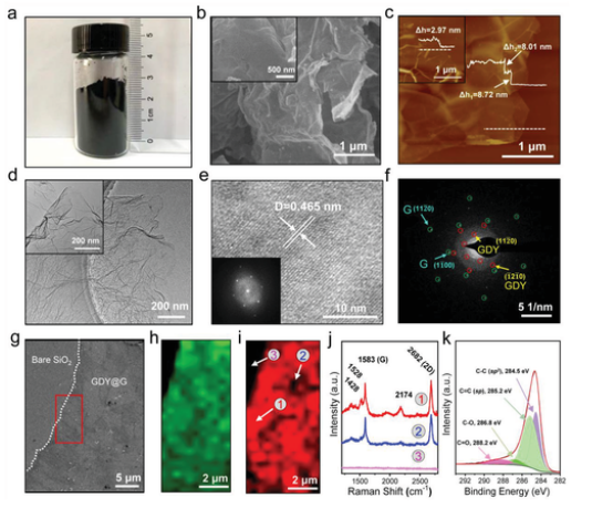 -1)。j)在(i)中選定位置不同位置的拉曼光譜。k) GDY/G元素C 1s的窄掃描XPS譜。