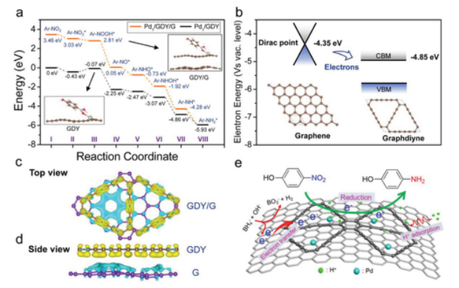 1/GDY上4-NP的氫化的勢(shì)能曲線。b)石墨烯和GDY的電子能。石墨烯和GDY之間真實(shí)空間電子再分布的c)頂部圖和d)側(cè)面圖。e) Pd