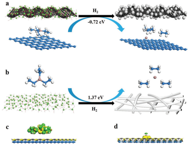 Figure 1. 示意圖:(a)Al@GNs的合成和(b)在高壓氫氣下不存在石墨烯的Al納米纖維(NFs)的合成;(C)TEAL和(d)Al在石墨烯上的弛豫原子構(gòu)型和電荷-密度-差異等值面。
