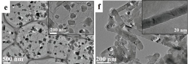 Figure 2. 所制備的Al@GNs的(a)SEM、(b)TEM(插圖:HRTEM圖像)和(c)STEM圖像;(d)Al@GNs的掃描TEM圖像和相應(yīng)碳(C)和鋁(Al)的元素映射圖像;(e)在氬氣下合成的Al@GNs的代表性TEM圖像和f)在與Al@GNs相同的條件下合成但不存在石墨烯的鋁納米纖維(插圖:?jiǎn)我患{米纖維的放大圖像)。