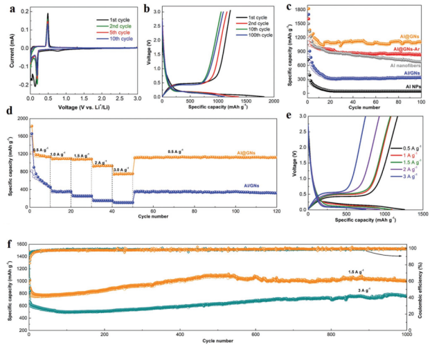 Figure 3. LIBs中Al@GNs電極的電化學(xué)性能。(a)Al@GNs電極最初十個(gè)循環(huán)的循環(huán)伏安圖,掃描速率為0.1 mV/s;(b)0.5 A/g下,所選循環(huán)的恒電流放電-充電曲線;(c)在0.5 A/g下,Al@GNs電極上的循環(huán)性能,包括Al@GNs-Ar、Al納米纖維、Al NPs和Al/GNs用于比較;d)Al@GNs電極的倍率性能,其電位曲線如(e)所示;(f)Al@GNs電極在1.5和3 A/g下的循環(huán)性能。