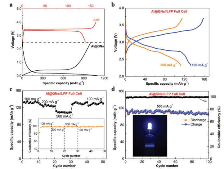 Figure 6. Al@GNs@LFP全電池的儲(chǔ)能性能:(a)商業(yè)LFP和Al@GNs半電池的恒電流放電-充電圖;全電池(b)在100和500 mA/g時(shí)的恒電流放電-充電曲線;(c)倍率性能(插圖:庫(kù)侖效率)和(d)在500 mA/g下的循環(huán)性能(插圖:由完整電池供電的藍(lán)色LED燈)。