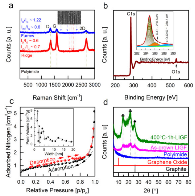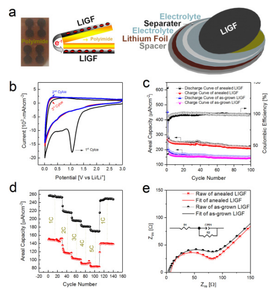 Fig. 1. (a)LIGF生長(zhǎng)示意圖,(b)LIGF的泡沫像形態(tài),(C)直到450℃,聚酰亞胺穩(wěn)定。