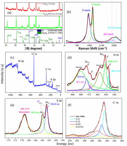 2/RGO樣品的XPS圖。(d) Ni,(e) S和(f) C的高分辨率XPS譜。