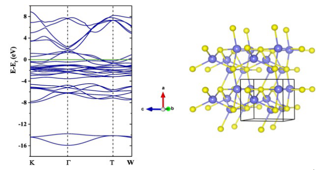 2的費(fèi)米能級(jí)和晶體結(jié)構(gòu)。藍(lán)色和黃色球體代表鎳(Ni)和硫(S)原子(右)。
