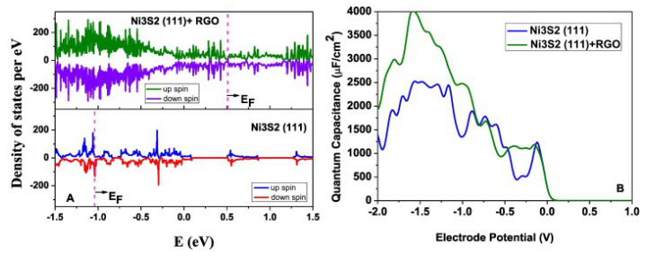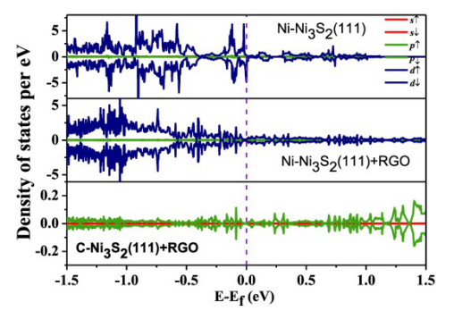 2-RGO可增強(qiáng)電荷轉(zhuǎn)移特性。此外,密度泛函理論(DFT)模擬推斷,C p軌道和Ni d軌道之間的強(qiáng)雜化導(dǎo)致電化學(xué)性能和態(tài)密度(DOS)的增強(qiáng),是提高Ni