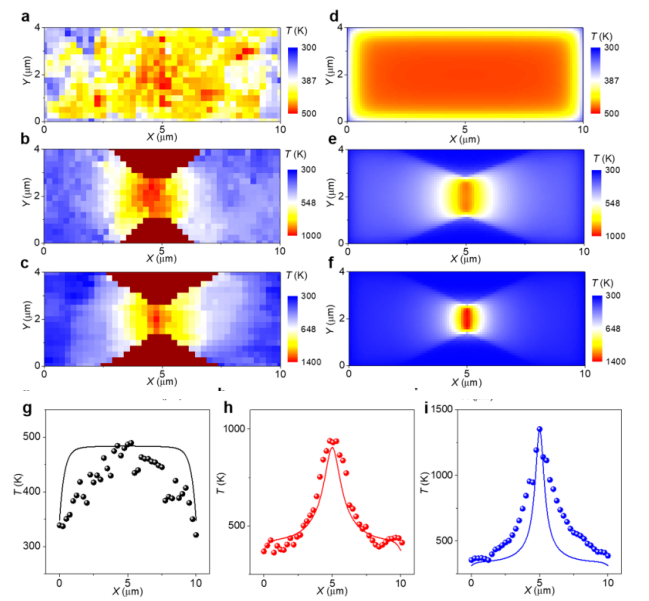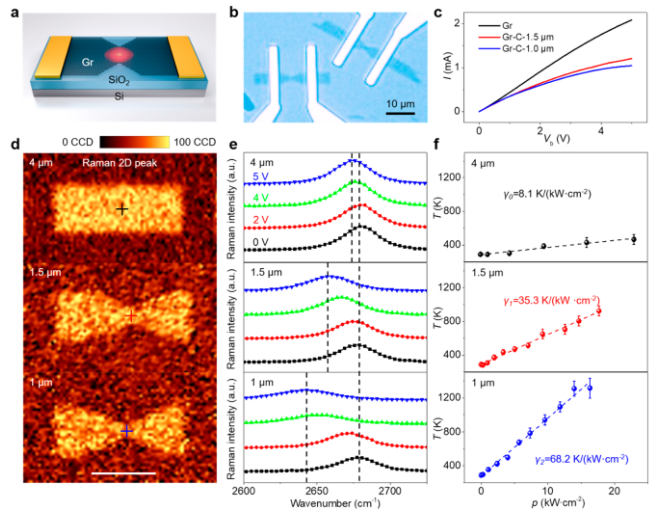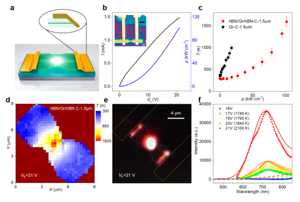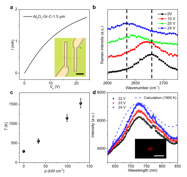 Figure 4. Al2O3封裝的石墨烯熱發(fā)射器的表征:(a)制備的Al2O3封裝的石墨烯收縮裝置(Al2O3-Gr-C-1.5μm)的I-Vb曲線;插圖是石墨烯器件的光學(xué)圖片,比例尺:10μm;(b)石墨烯作為施加偏壓函數(shù)的拉曼2D峰;(c)測(cè)量晶格溫度作為提供的電功率密度的函數(shù);(d)不同Vb下Al2O3-Gr-C-1.5μm的發(fā)光光譜,插圖是在Vb=24 V下照射石墨烯器件的光學(xué)圖,比例尺:4μm。