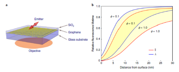 Figure 1. 石墨烯基MIET。(a)gMIET實(shí)驗(yàn)的示意圖,(b)相對(duì)熒光壽命τ/τ