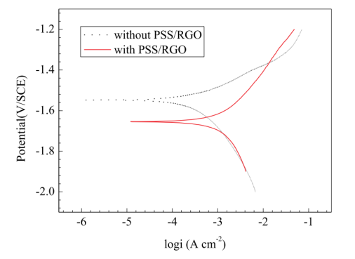 Figure 4. Mg-6wt%Al-1wt%In在3.5%NaCl和3.5%NaCl+1%PSS/RGO溶液中的極化曲線。