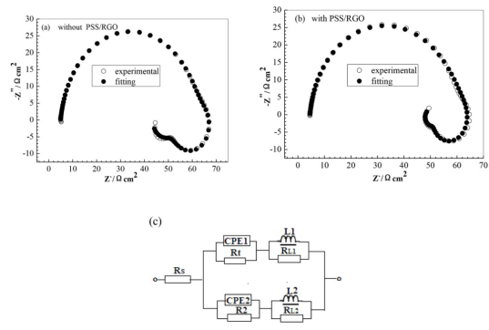 Figure 6. 在(a)3.5%NaCl溶液、(b)3.5%NaCl+1%PSS/RGO溶液中Mg-6wt%Al-1wt%In的EIS譜和(c)EIS的等效電路。