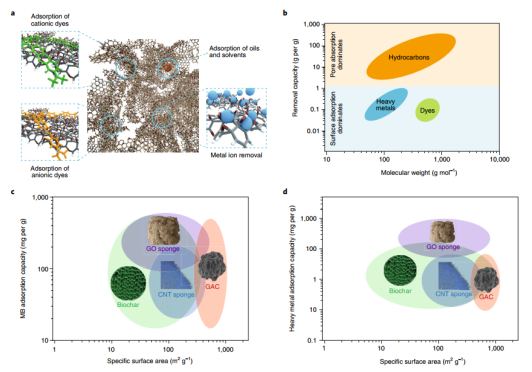 Figure 2. 3DM用于從水中去除污染物:a,研究3DM以去除各種污染物;b,文獻(xiàn)數(shù)據(jù)分析表明,GO 3DMs對碳?xì)浠衔锏娜コ芰Ω哂诮饘俸腿玖?;c,將GO海綿的MB吸附容量與其他類型的碳基3DM進(jìn)行比較;d,與c類似,將GO海綿的重金屬吸附能力與其他類型的碳基3DM進(jìn)行比較。