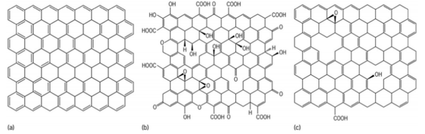 Figure 1. (a)石墨烯、(b)GO和(c)rGO的晶體結(jié)構(gòu)。