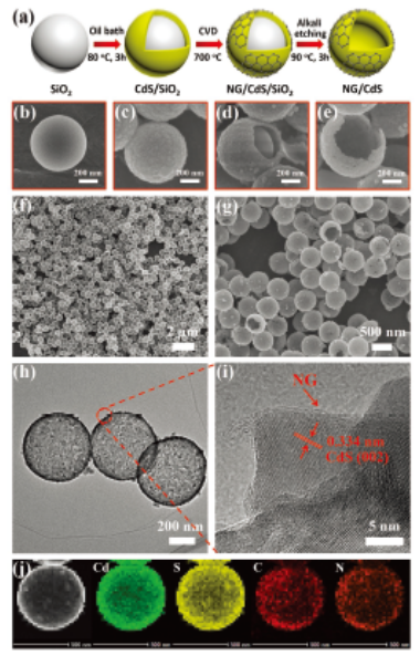 Figure 1.(a)NG/CdS HS制備過程示意圖,(b-e)相應(yīng)的場發(fā)射掃描電鏡圖(FESEM),(f,g)CdG2的FESEM圖,(h,i)CdG2的TEM圖, (j)CdG2的STEM圖及其相應(yīng)的元素漫譜圖。