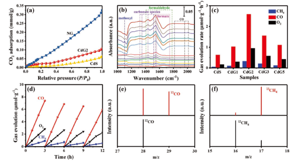 Figure 3. (a)CdS, NG, 和 CdG2的CO2吸附曲線,(b)CdG2的DRIFTS譜,(c)CdS, CdG1, CdG2, CdG3, and CdG5的光催化CO2還原性能表征,(d)CdG2循環(huán)性能測試(12次),(e,f)CdG2產(chǎn)生的CO和CH4的氣相色譜質(zhì)譜聯(lián)用(GC-MS)分析。