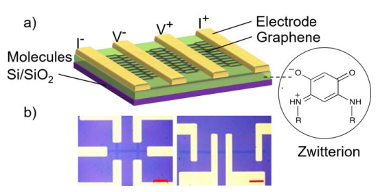 Figure 1. 樣品設(shè)計(jì):(a)石墨烯-分子層裝置,(b)傳統(tǒng)裝置的光學(xué)照片。