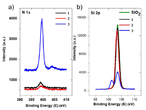 Figure 2.(a)分子1,2,3分別在SiO2基板上的N 1s XPS譜,(b)分子1,2,3分別在SiO2基板上的Si 2p XPS譜。