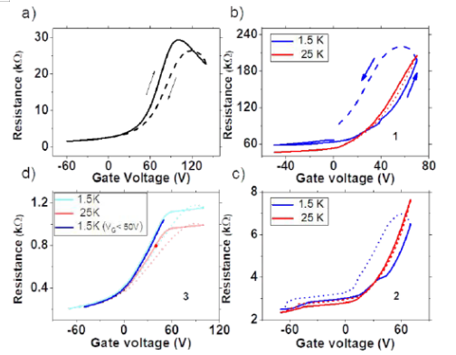 Figure 3. CVD石墨烯轉(zhuǎn)移到SiO2裝置上的晶體管轉(zhuǎn)移曲線:(a)樣品轉(zhuǎn)移到空白SiO2基板上,在室溫下測(cè)量,(b-d)基板被QZW分子層覆蓋,此時(shí)組成裝置的轉(zhuǎn)移曲線(分子1,2,3先后向石墨烯轉(zhuǎn)移)。