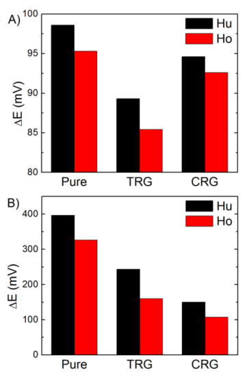 Figure 3. 由峰-峰分離值(ΔE)表示異質(zhì)電子轉(zhuǎn)移。使用一對(duì)氧化還原探針:(A)[Ru(NH3)6]2+/3+和(B)[Fe(CN)6]3-/4-。