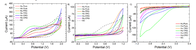 Figure 5. 在50 mM PBS(pH:7.2)中的(a)5 mM肼、(b)5 mM NaHS和(c)5 mM過氧化氫異丙苯存在下記錄的循環(huán)伏安圖。