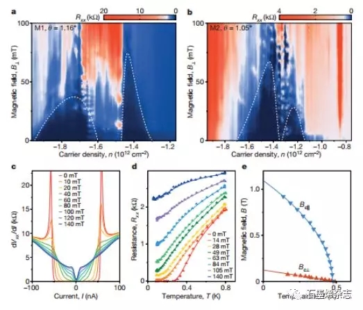 Figure 3.在魔角TBG中超導(dǎo)狀態(tài)的磁場(chǎng)響應(yīng)。