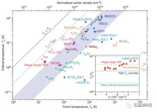 在這里,實(shí)現(xiàn)了非常規(guī)的超導(dǎo)性,這是不能通過(guò)弱的電子-質(zhì)子相互作用解釋的,而是由堆疊兩層石墨烯片經(jīng)過(guò)扭轉(zhuǎn)一定小角度產(chǎn)生的二維超晶格打造的超導(dǎo)體。扭轉(zhuǎn)角度大約在1.1°左右為第一個(gè)魔角,這種扭曲的雙層石墨烯的電子能帶結(jié)構(gòu)表現(xiàn)出接近零費(fèi)米能級(jí)的扁平帶,導(dǎo)致半填充時(shí)的絕緣狀態(tài)。在靜電摻雜材料時(shí),我們觀察到可調(diào)零電阻狀態(tài)是在臨界溫度為1.7 K實(shí)現(xiàn)的,即此時(shí)材料變成超導(dǎo)體。扭曲雙層石墨烯的溫度-載流子密度相圖類(lèi)似于銅氧化物(或銅酸鹽),并且包括對(duì)應(yīng)于超導(dǎo)性的圓頂形部分。此外,材料的縱向電阻中的量子振蕩表明鄰近絕緣態(tài)的低費(fèi)米表面的存在,類(lèi)似于低度摻雜的銅酸鹽。該扭曲雙層石墨烯的較高超導(dǎo)臨界溫度,鑒于如此小的費(fèi)米能面,這就意味著它可以以傳統(tǒng)超導(dǎo)體10-4的電子實(shí)現(xiàn)超導(dǎo)性。扭曲雙層石墨烯是一種精確可調(diào)的,純碳基二維高溫超導(dǎo)體。