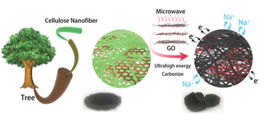 纖維素以其豐富、可再生、低成本等優(yōu)點,成為了一種極具發(fā)展前景的天然生物高分子材料。本文提出了一種利用纖維素納米纖維(CNFs)在微波輻照下制備鈉離子電池(SIBs)鈉化碳陽極的新方法,用于潛在的超高速和大規(guī)模制造。由于CNFs對微波的吸收較弱,通常不可能通過微波處理直接碳化CNFs,但研究發(fā)現(xiàn)少量還原氧化石墨烯(rGO)可以作為有效的引發(fā)劑。微波還原氧化石墨烯(rGO)釋放出極高的能量,導(dǎo)致局部超高溫和超高的升溫速率,從而致使CNFs快速碳化,并在幾秒鐘內(nèi)產(chǎn)生鈉化碳質(zhì)材料。碳質(zhì)材料中的鈉是由含鈉離子羧基的CNFs碳化引入的,它為鈉離子插入碳質(zhì)陽極的嵌鈉/脫鈉提供了良好的空間,從而提高了鈉離子插入碳質(zhì)陽極的電化學(xué)性能。當(dāng)微波化的 rGO-CNF (MrGO-CNF)被用作SIBs的陽極時,可提供558 mAh g−1的高初始容量,并在200次循環(huán)后仍保持340 mAh g−1的容量。良好的可逆性和循環(huán)穩(wěn)定性表明,MrGO-CNF是鈉離子電池的理想陽極。