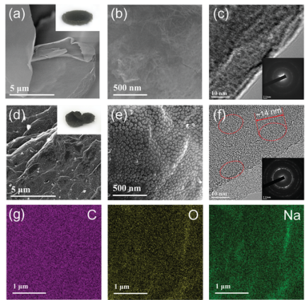 Figure 2. (a,b) GO-CNF)和(d,e) MrGO-CNF的SEM圖。(c) GO-CNF和(f) MrGO-CNF的TEM圖。(g) MrGO-CNF的元素映射。