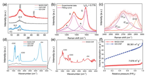 Figure 3. (a) GO-CNF、rGO-CNF和MrGO-CNF的XRD圖。(b) MrGO-CNF的拉曼光譜。(c) MrGO-CNF的2D峰值。 MrGO-CNF的(d) FT-IR圖和e)隔離FT-IR圖。(f) MrGO-CNF的N2吸附-解吸等溫曲線。