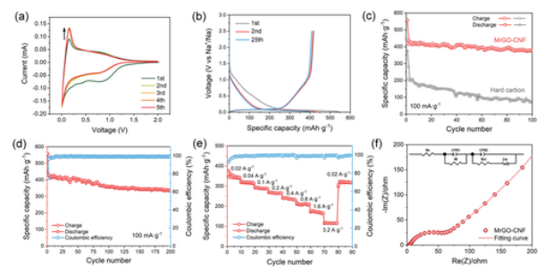 Figure 5. MrGO-CNF陽極的鈉離子半電池。(a) MrGO-CNF在掃描速率為0.1 mV s−1時的CV曲線。(b)電流密度為100 mA g−1時,電位范圍為0.001-2.5 V,MrGO-CNF的第1、2和25個周期的恒流嵌鈉/脫鈉曲線。(c) MrGO-CNF(紅線)和硬質(zhì)碳(灰線)的充放電循環(huán)性能。(d)電流密度為100 mA g−1時,MrGO-CNF的充放電循環(huán)性能。(e) MrGO-CNF的倍率性能。(f) MrGO-CNF的Nyquist圖及其等效電路。