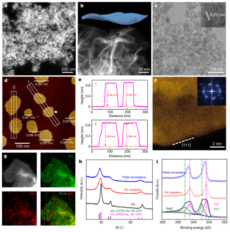 Fig. 1:PdMo雙金屬烯的形貌、結構和組成表征。PdMo雙金屬烯的(a)低倍HAADF-STEM,(b)高倍HAADF-STEM和(c) TEM 圖。PdMo雙金屬烯的(d)AFM圖和(e)相應的高度剖面圖。(f)單片雙金屬烯納米薄片的高分辨率HAADF-STEM圖。工業(yè)Pd/C、Pd金屬烯和PdMo雙金屬烯催化劑的(h)PXRD圖譜和(i)XPS譜。