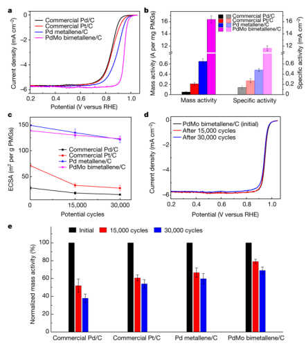 Fig. 2:PdMo雙金屬烯/C、Pd金屬烯/C、工業(yè)催化劑Pt/C和Pd/C的電催化性能。該催化劑(相對于RHE)在0.1 M KOH中0.9 V電位下的(a)ORR極化曲線和(b)質(zhì)量比活性的比較。該催化劑的(c)ECSAs 、(d)ORR極化曲線和(e)質(zhì)量活度變化。