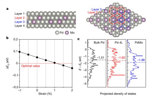 Fig. 3:DFT計算氧吸附能和d帶中心。(a)左邊:四層PdMo雙金屬烯原子模型的側視圖。右邊:原子模型的俯視圖。(b)PdMo雙金屬烯的?EO為壓縮(負)和拉伸(正)應變的函數(shù)。水平紅線表示最優(yōu)?EO值。(c)在體鈀、四層鈀板(Pd 4L)和PdMo中,表面鈀原子的d帶電子密度的預測。水平虛線表示計算出的d波段中心。
