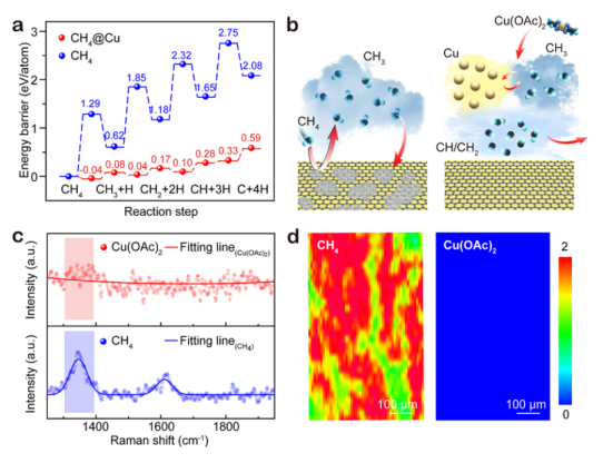 Figure 2. Cu(OAc)2對(duì)清潔度提高的理論研究:(a)在有(紅色)和沒(méi)有(藍(lán)色)Cu催化劑(蒸氣)的情況下,氣相中CH4脫氫計(jì)算出的能壘;(b)氣相中Cu蒸氣在促進(jìn)碳物質(zhì)分解和抑制無(wú)定形碳形成中的作用示意圖;(c,d)使用Cu(OAc)2(紅色)和CH4(藍(lán)色),石墨烯生長(zhǎng)期間在邊界層中收集物質(zhì)的典型拉曼光譜(c)和(d)相應(yīng)的D峰映射。