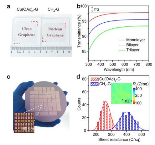 Figure 1. Cu(OAc)2衍生的石墨烯的清潔度得到提高:(a)比較Cu(OAc)2-和CH4-衍生的石墨烯的清潔度;不透明石墨烯的(b)AFM和(c)TEM圖像;(c)的插圖:(c)中正方形區(qū)域的FFT模式;使用Cu(OAc)2作為碳源獲得的干凈石墨烯的(d)AFM和(e)TEM圖像;(e)的插圖:相應(yīng)TEM圖像的FFT模式(頂部)和HRTEM圖像(底部);(f)使用TiCl4蒸發(fā)進(jìn)行TiO2可視化后,由Cu(OAc)2(頂部)和CH4(底部)生長(zhǎng)的大面積石墨烯薄膜的照片;(g)清潔(紅色)和不清潔(藍(lán)色)石墨烯上TiO2納米顆粒的密度;插圖:依次使用Cu(OAc)2和CH4生長(zhǎng)石墨烯的SEM圖像。