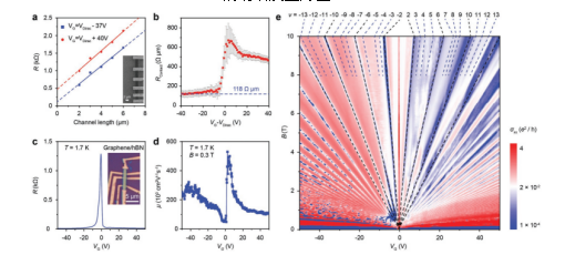 Figure 3. 所獲得的超凈石墨烯的優(yōu)異電子性能:a)源極漏極電阻與溝道長度的關系;插圖:經(jīng)TLM測量的石墨烯晶體管陣列的SEM圖像,比例尺:2 µm;b)接觸電阻與柵極偏置的關系;c)hBN封裝的超純石墨烯的電阻率在T = 1.7 K時隨柵極電壓(VG)的變化;插圖:封裝石墨烯的霍爾棒器件的光學顯微鏡圖像;d)霍爾遷移率與背柵電壓(VG)的關系;e)(c)中器件的縱向電導率(σxx)與磁場B和VG的關系。