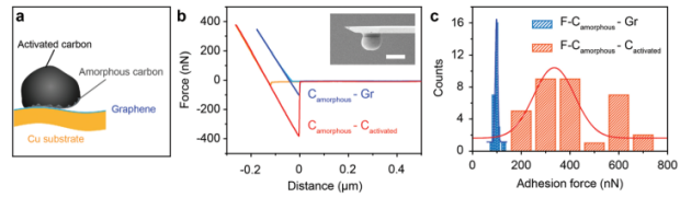 Figure 4. 強制設計的清潔石墨烯表面的機制:a)界面力模型;b)F-Camorphous-Cactivated和F-Camorphous-Gr的典型測量粘附力;插圖:裝配有無定形碳涂層微球探針的預制AFM尖端的SEM圖像;比例尺:10 µm;c)使用相同的無定形碳涂層微球探針測量的Camorphous-Cactivated和Camorphous-Graphene的粘附力直方圖。