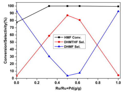 Figure 3. RuPd/RGO催化劑中Ru/(Ru+Pd)質(zhì)量比對DHMTHF和DHMF選擇性的影響。