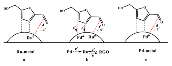 Figure 4. HMF在(a)2Ru/RGO、(b)1Ru1Pd/RGO和(c)2Pd/RGO上的吸附和活化。