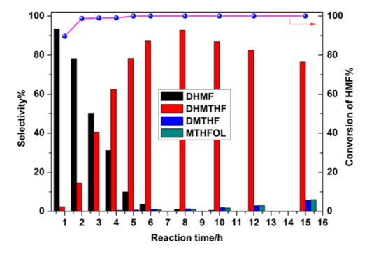 Figure 1. 不同催化劑上HMF加氫制DHMTHF。