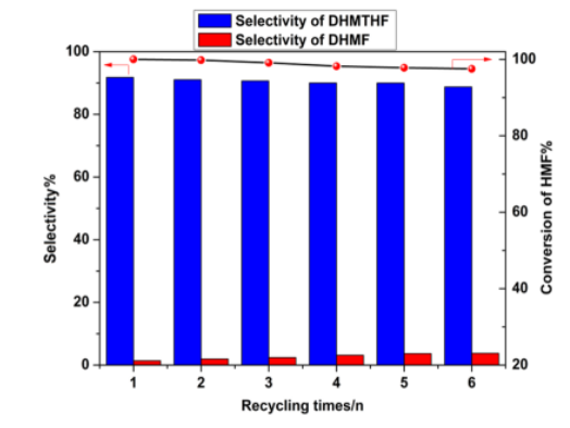 Figure 6. HMF加氫催化劑的穩(wěn)定性;反應(yīng)條件:0.3 g HMF,9.7 g水,20°C,t = 8 h,1.0 MPa H