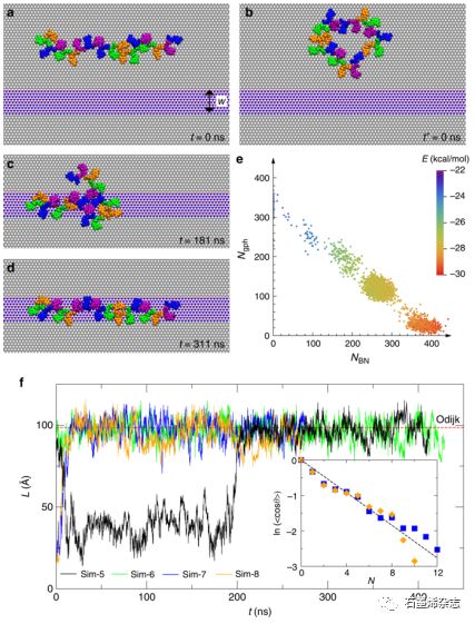 Fig. 2 在石墨烯/h-BN/石墨烯異質結構上模擬ssDNA運動。(a)石墨烯域上ssDNA的初始線性構象(Sim-5和Sim-6)。(b)石墨烯疇上ssDNA的初始環(huán)狀構象(Sim-7和Sim-8)。(c,d) ssDNA在181和311 ns處的構象(Sim-5)。(e)與ssDNA接觸的異質結構中原子數(shù)目的散點圖。(f)在所有四個模擬中,ssDNA的端到端距離。