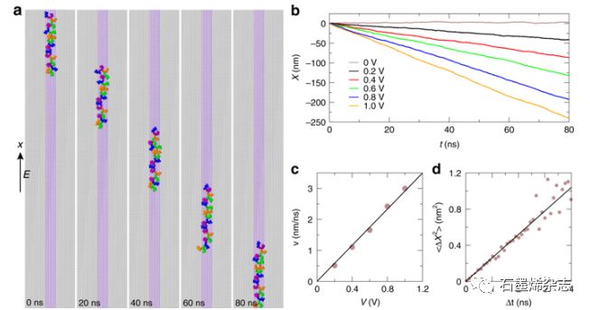Fig. 3 ssDNA在石墨烯/h-BN/石墨烯異質結構上的電泳轉運。(a)不同時間ssDNA電驅動運動示意圖(V = 0.2 V)。(b) ssDNA在各種外部偏置電壓下的時變位移。(c)不同偏置電壓下ssDNA的平均速度。(d)當V = 0 V時,ssDNA在不同時間間隔的均方位移。